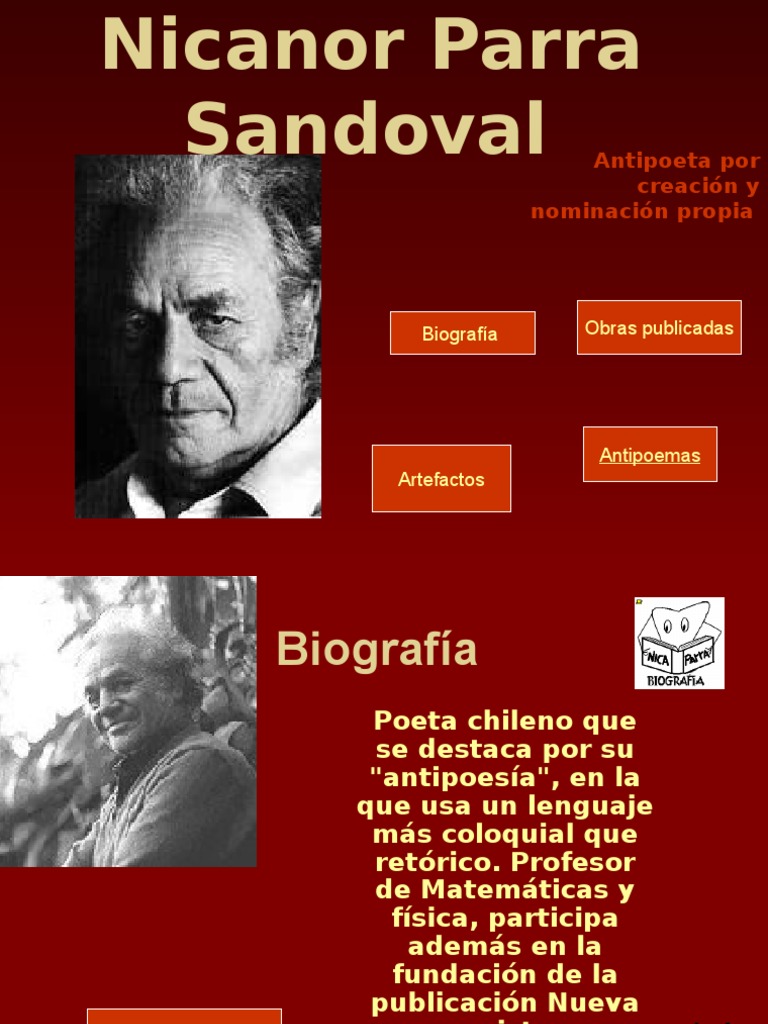 Nicanor parra biografia. Esordisce nel 1937 con Cancionero sin nombre con un linguaggio colloquiale e prevalenza di temi popolari. La madre tejedora y aficionada a la música folclórica. Nicanor Parra 1914-2018 Rupturista desafiante mordaz la obra de este raro inventor produjo un corte radical en la poesía hispanoamericana dando origen a un nuevo modelo literario.