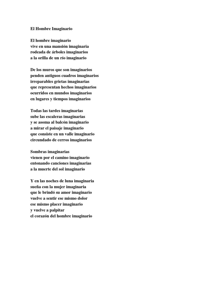 Es por ello que el poeta nos presenta a ese hombre imaginario a esa persona que ha perdido ese amor que le llenaba en todos los aspectos y que sin embargo decidido abandonarlo apartarlo de su vida con el agravante de abandonar el pueblo en el que estaban con todo lo que eso supone desde el punto de vista personal social y sobre todo sentimental. El hombre imaginario. El hombre imaginario el hombre imaginario vive en una mansión imaginaria rodeada de árboles imaginarios a la orilla de un río imaginario de los muros que son imaginarios penden antiguos cuadros imaginarios irreparables grietas imaginarias que representan hechos imaginarios ocurridos en mundos imaginarios en lugares y tiempos imaginarios todas las.